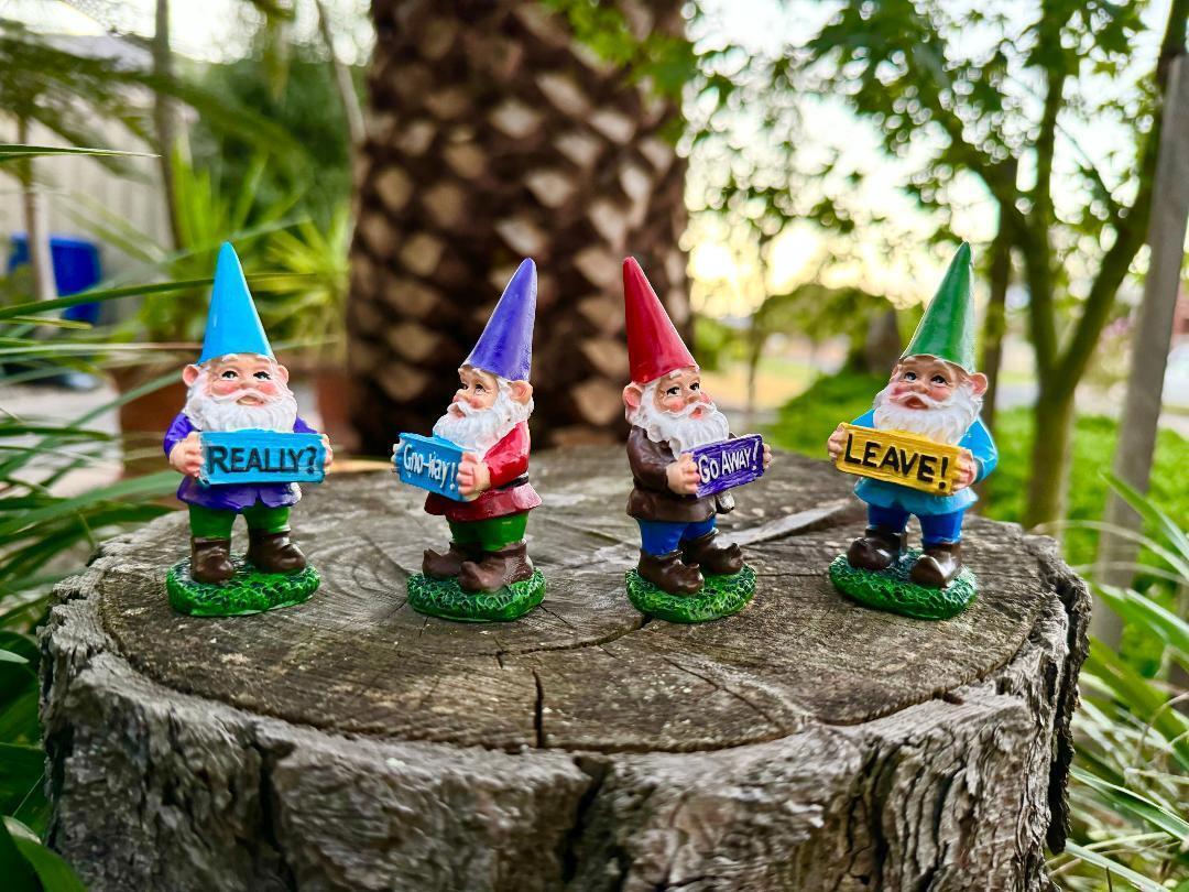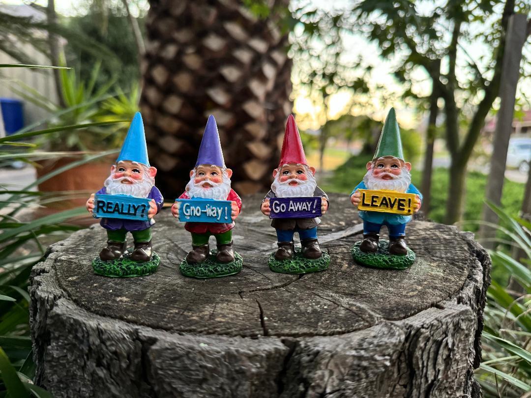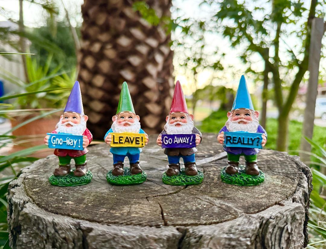 - Package include: Set of 4 Garden Gnomes with wording 'Really, Gno-way, Go Away, Leave!'