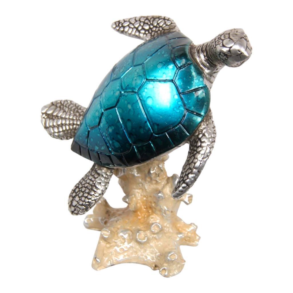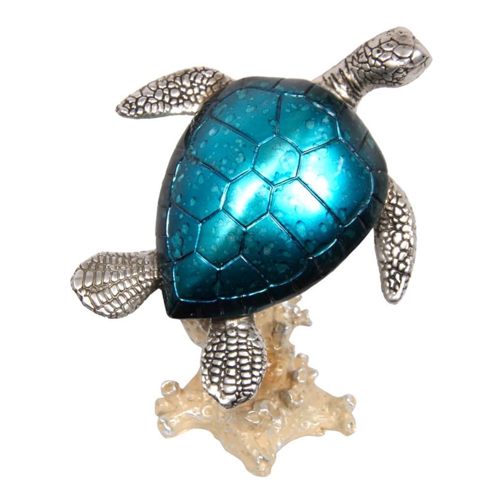 Blue Sea Turtle On Coral Statue 18cm Figurine Metallic Gift Decor Ornament