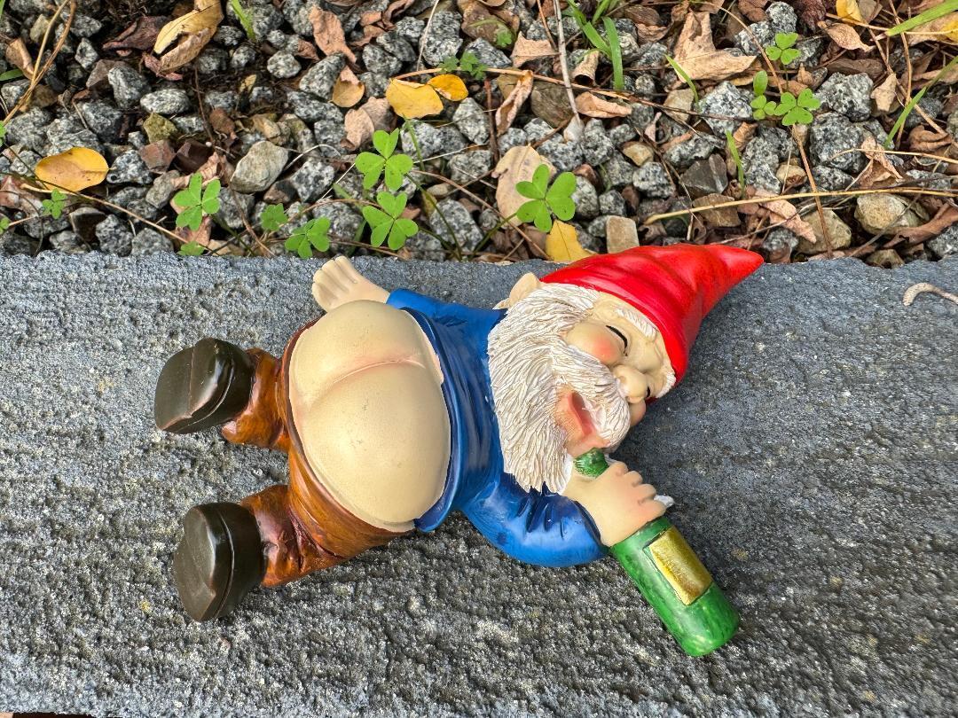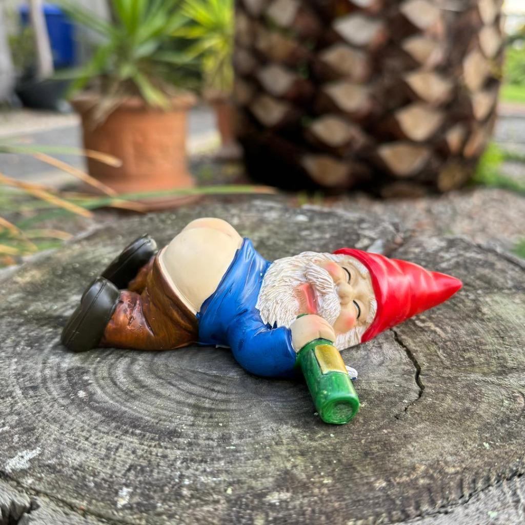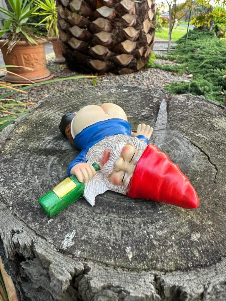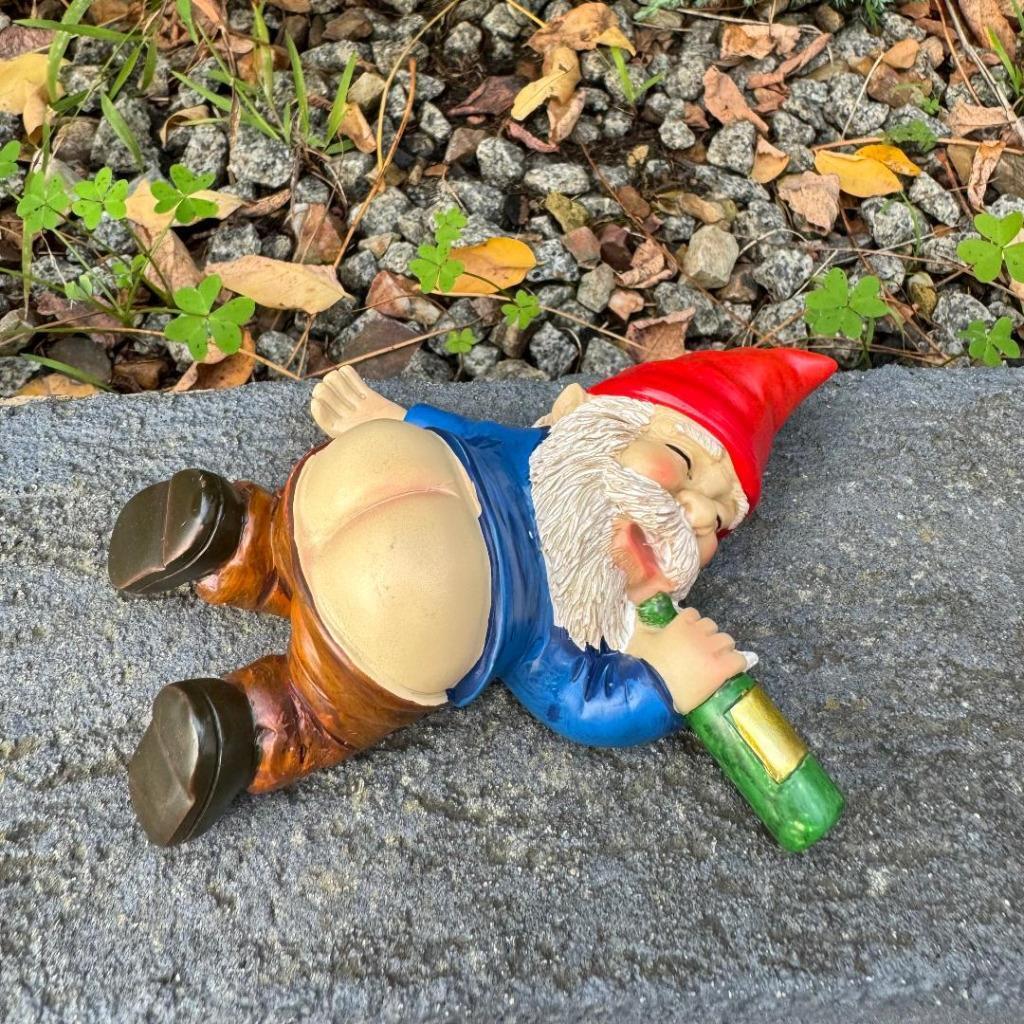 - Brighten up your garden decor with laughter, show your sense of humor and a hysterical fantasy add to your yard with this drunk black out gnome.
