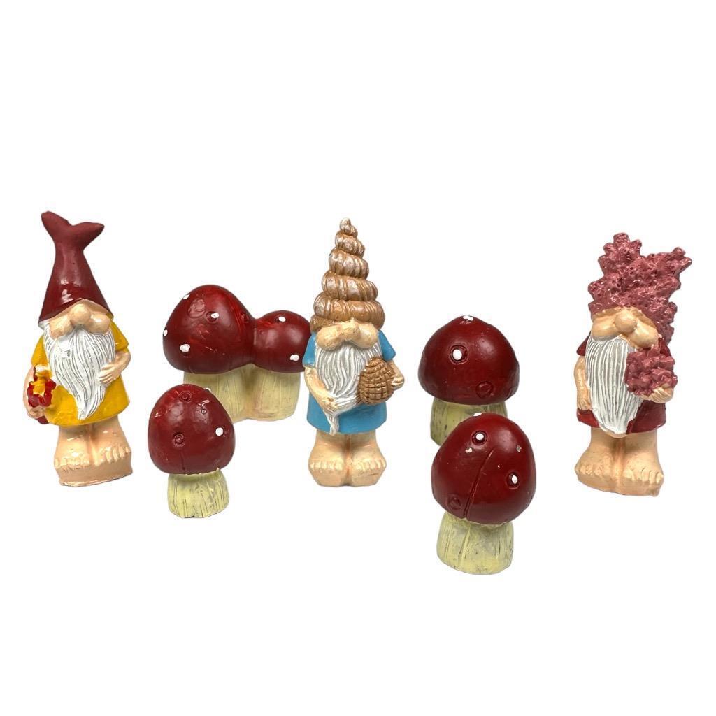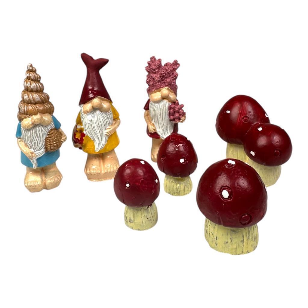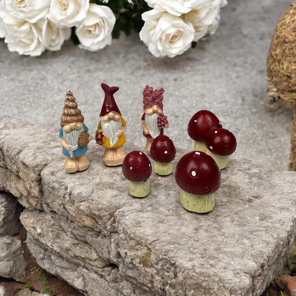 - Included in Package:Â 3 adorable garden gnomes and 4 whimsical miniature mushrooms.